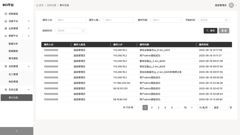 * 审计日志 查看平台用户操作日志。 功能: * 搜索:可以根据操作人ID,操作人姓名,操作内容,开始和结束时间进行搜索。