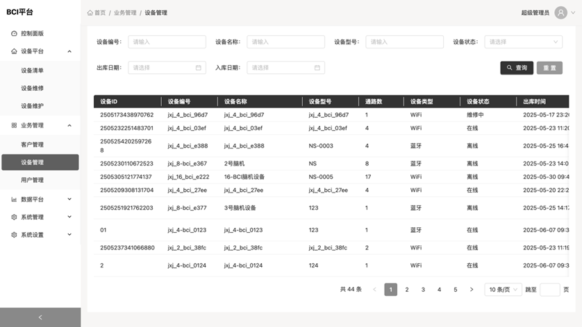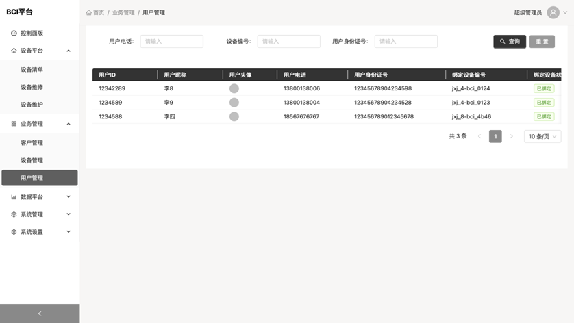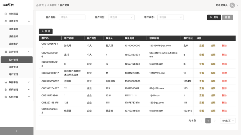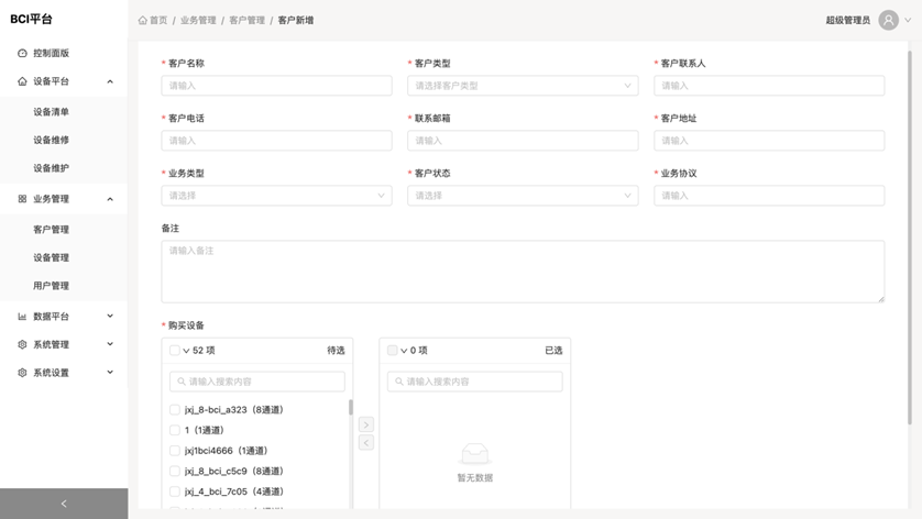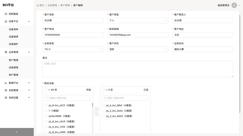 * 客户管理 展示客户列表,该页面用户信息可用于登陆 流程:管理员需要先将设备导入到设备清单,然后在这里添加客户,并将导入的设备绑定到该客户下,这样客户登陆后就显示这批设备了 功能: * 搜索:以根据客户名称模糊搜索,也可以选择客户类型和客户状态搜索 * 查看:点击查看展示客户详情 * 编辑:点击编辑跳转至编辑列表 * 删除:点击弹出确认删除对话框,删除后数据无法恢复  * 客户编辑 编辑客户信息,这里可以编辑客户信息,也可以追加购买设备  * 客户新增 录入客户信息,并将购买的设备添加至购买列表  * 设备管理 展示设备状态 功能: * 搜索:可根据设备编号,设备名称,设备型号模糊搜索,也可查询设备状态,出厂日期及入库日期 * 用户管理 展示用户绑定设备信息 功能: * 搜索:可以根据用户电话,设备编号,用户身份证号进行模糊查询