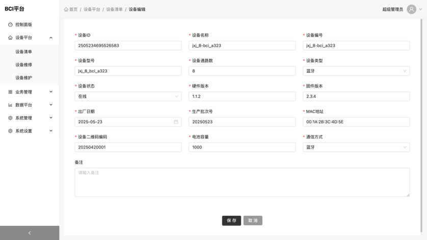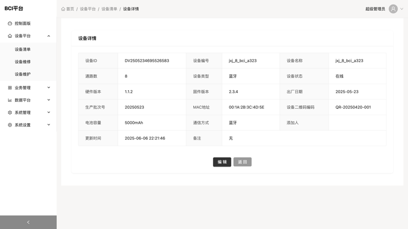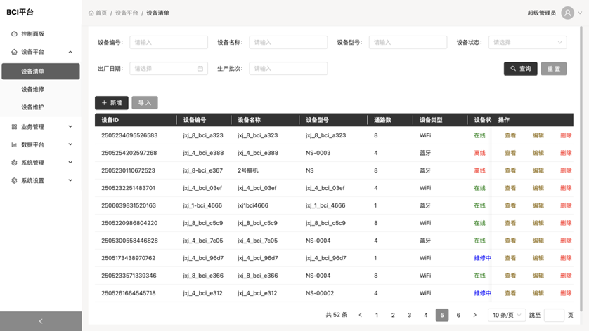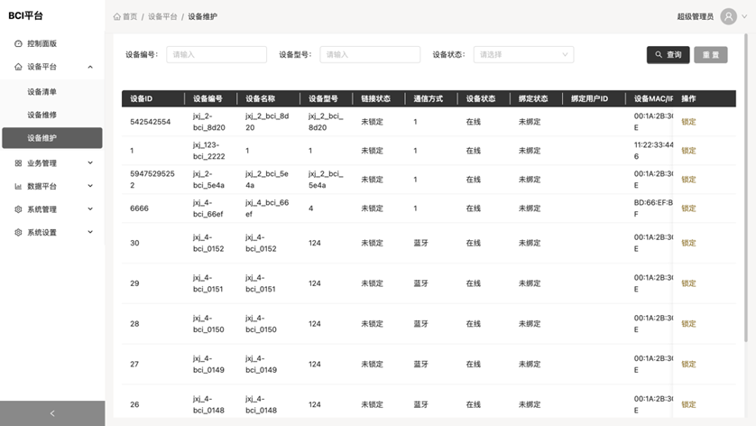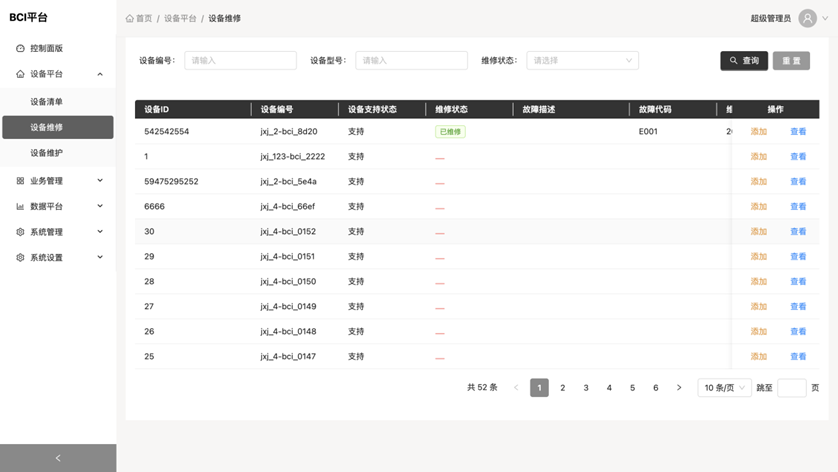 - 设备清单: 客户登陆上去后即可看到已购买的设备列表,目前客户账号不支持自主添加,购买设备后设备信息会自动展示到设备清单 功能: - 搜索:支持设备编号,设备名称,设备型号模糊搜索;支持设备状态,出厂日期,生产批次搜索;点击重置即可清除搜索内容; - 查看:点击后跳转至设备详情页 - 编辑:点击后跳转至设备编辑页 - 删除:点击后弹出确认删除对话框,确认后即可删除该设备分页;目前支持手动点击分页号码即可跳转至对应页,也可以选择没页显示数量,还可以直接输入页码点击回车即可跳转至对应页  - 设备详情 在设备清单中点击编辑即可跳转至设备详情 设备详情展示设备基础信息,点击返回即可返回设备清单列表,点击编辑可对设备基础信息进行编辑  - 设备编辑 可以编辑设备的基础信息,保存后立即生效  - 设备维修 设备维修记录,可在此页面记录设备故障 功能: - 搜索:可根据设备编号,设备型号模糊搜索,也可以根据维修状态搜索 - 添加:点击添加弹出添加维修记录弹框,录入信息后点击保存即可添加维修记录 - 查看:点击查看可查看当前设备的维修记录  - 设备维护 设备维护状态 功能: - 搜索:可根据设备编号,设备型号模糊搜索,也可以根据设备状态进行搜索 - 锁定:点击锁定弹出锁定设备对话框,确认后设备将无法正常使用,直到手动解锁才能恢复