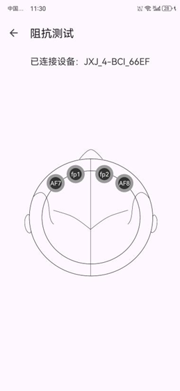 单击“打开阻抗测试”;自动跳转到“阻抗测试”页面,根据连接的硬件设备不同,会显示不同通道设备的阻抗页面; 下图展示的是4通道脑机设备;