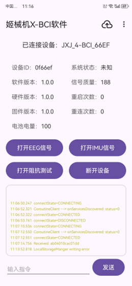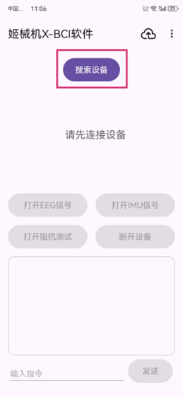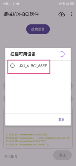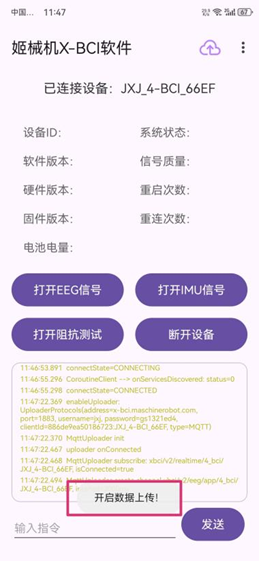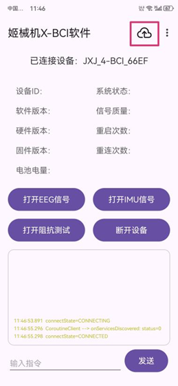 单击“搜索设备”,在弹出“扫描可用设备”选项框中选择相应的设备,自动跳转到设备主界面,成功连接;    “单击”APP右上角云朵图标,弹出“开启数据上传!”提示,开启实时上传功能。