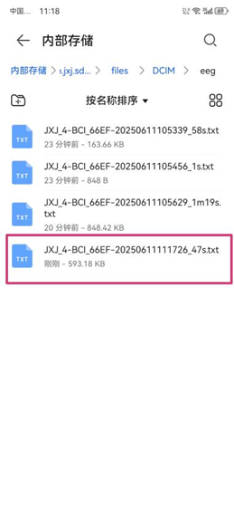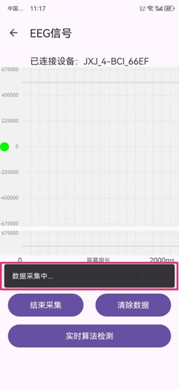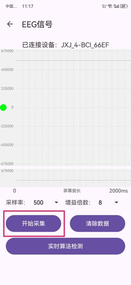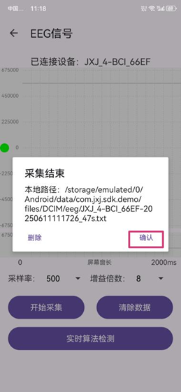 单击“搜索设备”,在弹出“扫描可用设备”选项框中选择相应的设备,跳转到设备主界面,成功连接;    单击“打开EEG信号”,单击“开始采集”,弹出提示“数据采集中...”,数据开始采集;    采集完成后,单击“结束采集”,弹出“采集结束”提示框,并告知存储本地路径,点击“确认”,即可将该段数据存储到上述路径下,在手机本地文件管理器中,可在上述路径下找到相应文件。