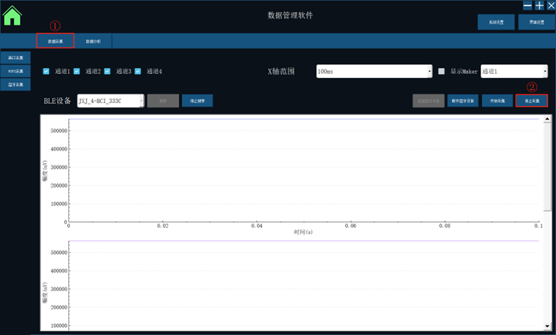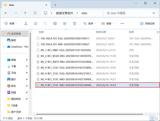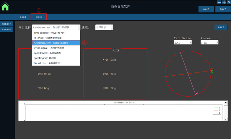 单击“开始采集”,即可开始采集IMU数据;  单击“数据分析”,切换到“数据分析”页面,单击“分析选择”选项栏,选择“Accelerometer:加速度+陀螺仪”,即可在下方看到IMU数据;  单击“数据采集”,返回“数据采集”页面,单击“停止采集”,即可结束IMU数据采集;  本地数据会自动保存到“数据采集软件”软件包的“data”文件夹下。
