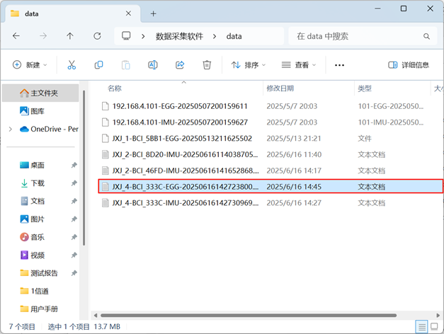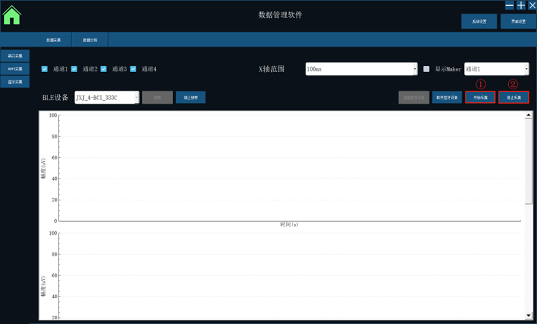 单击“开始采集”,再单击“结束采集”,即可采集到EEG数据;  本地数据会自动保存到“数据采集软件”软件包的“data”文件夹下。