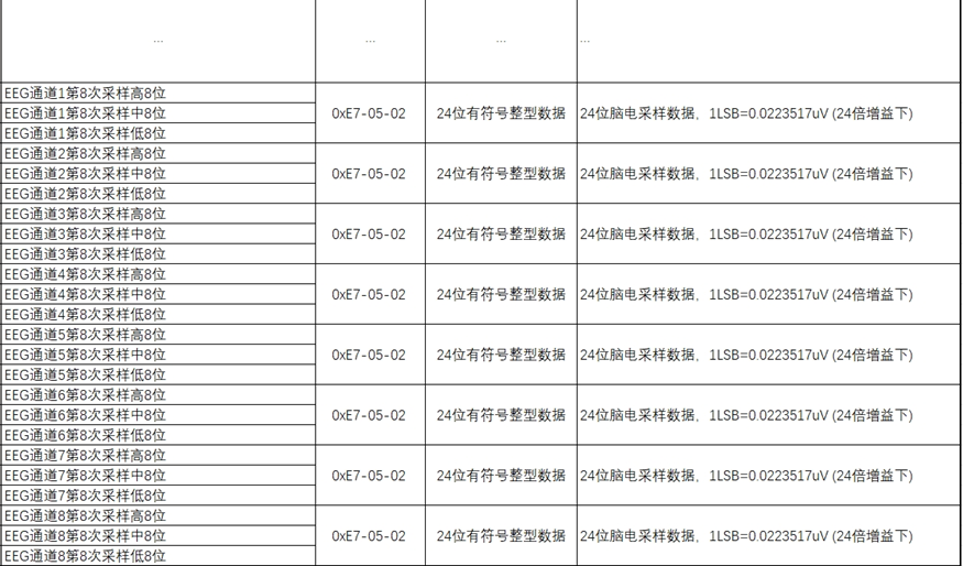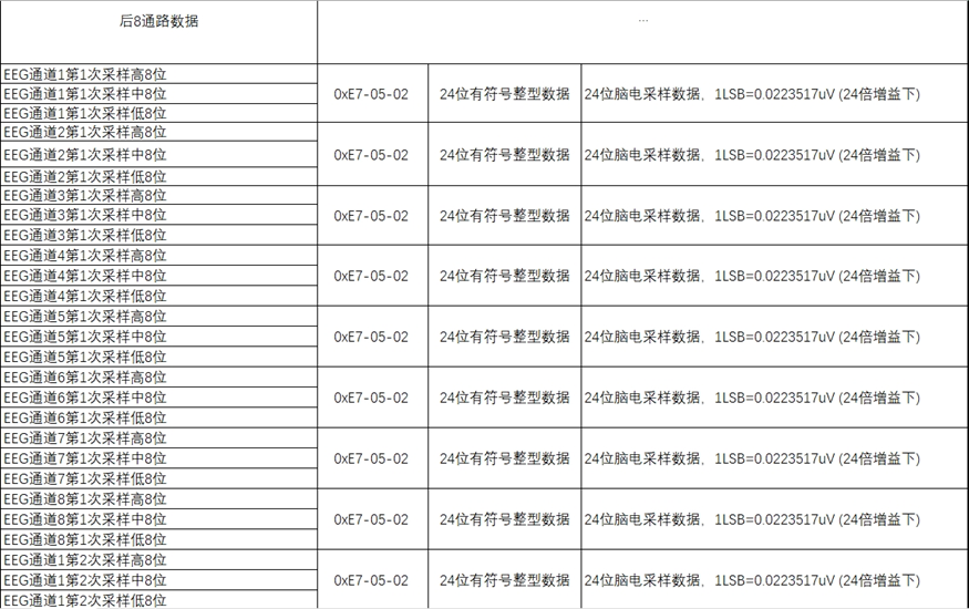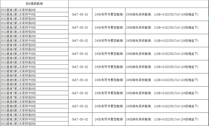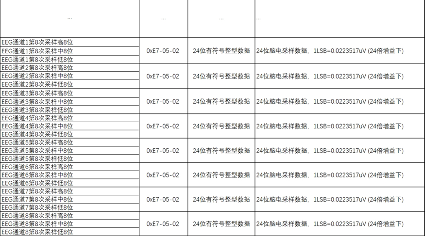 | **EEG采样频率** | **TCP发送频率** | **数据包长度** | | --------------------- | --------------------- | -------------------- | | 500Hz | 16ms | 384字节 | | 1000Hz | 8ms | 384字节 | 结构表: