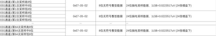 | **EEG采样频率** | **BLE发送频率** | **数据包长度** | | --------------------- | --------------------- | -------------------- | | 500Hz | 128ms | 192字节 | | 250Hz | 256ms | 192字节 | 结构表: