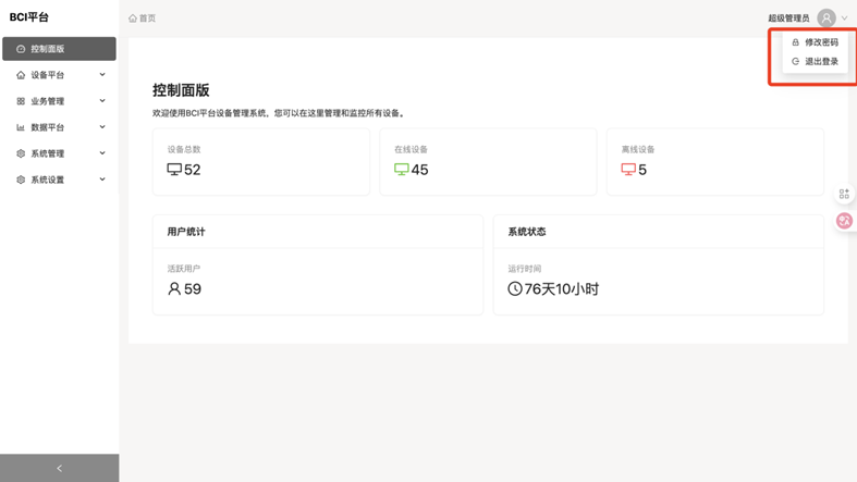在首页控制面板右上角可以进行账号的密码修改和退出操作。